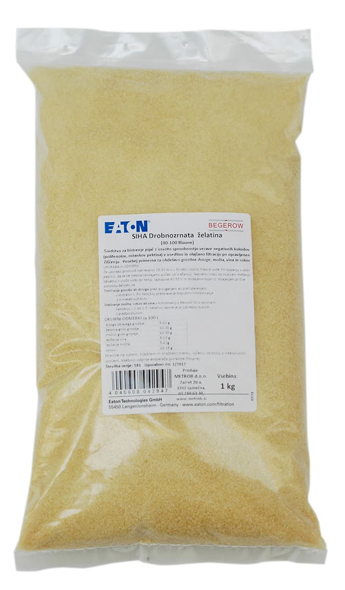 Želatina z izrazito sposobnostjo vezave negativnih koloidov (polifenolov, ostankov pektina) v usedlino in olajšano filtracijo po opravljenem čiščenju. Posebej primerna za obdelavo grozdne drozge, mošta, vina in sokov.