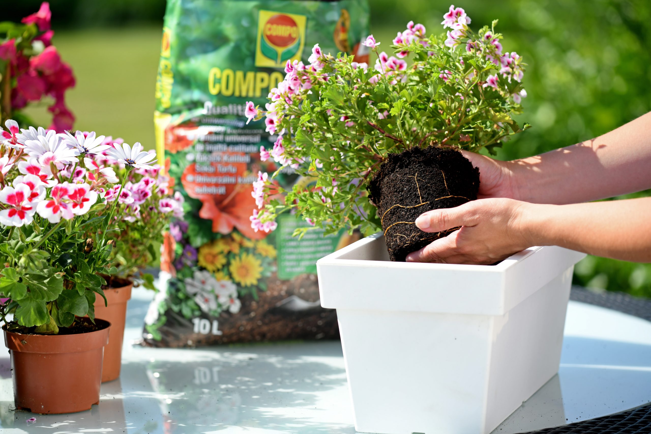 Da bi se izognili prekomerni vlagi, poskrbite za odvajanje vode s primerno drenažo. Nato nanesite plast COMPO SANA zemlje za balkonske rastline. Rastline v loncih in koritih imajo za svojo rast na razpolago razmeroma manj zemlje, zato je še posebej pomembno, da je le-ta dovolj kvalitetna. S pomočjo visokokakovostnega substrata bodo rastline preskrbljene za štiri tedne brez gnojenja, zato bodo lepo rasle in uspevale.